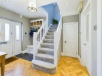 Accessed via composite double glazed door, Kardean flooring, power points, radiator, inset ceiling spotlights, stairs to first floor landing, bespoke storage unit with seating, under stairs storage cupboard. Doors lead off:
